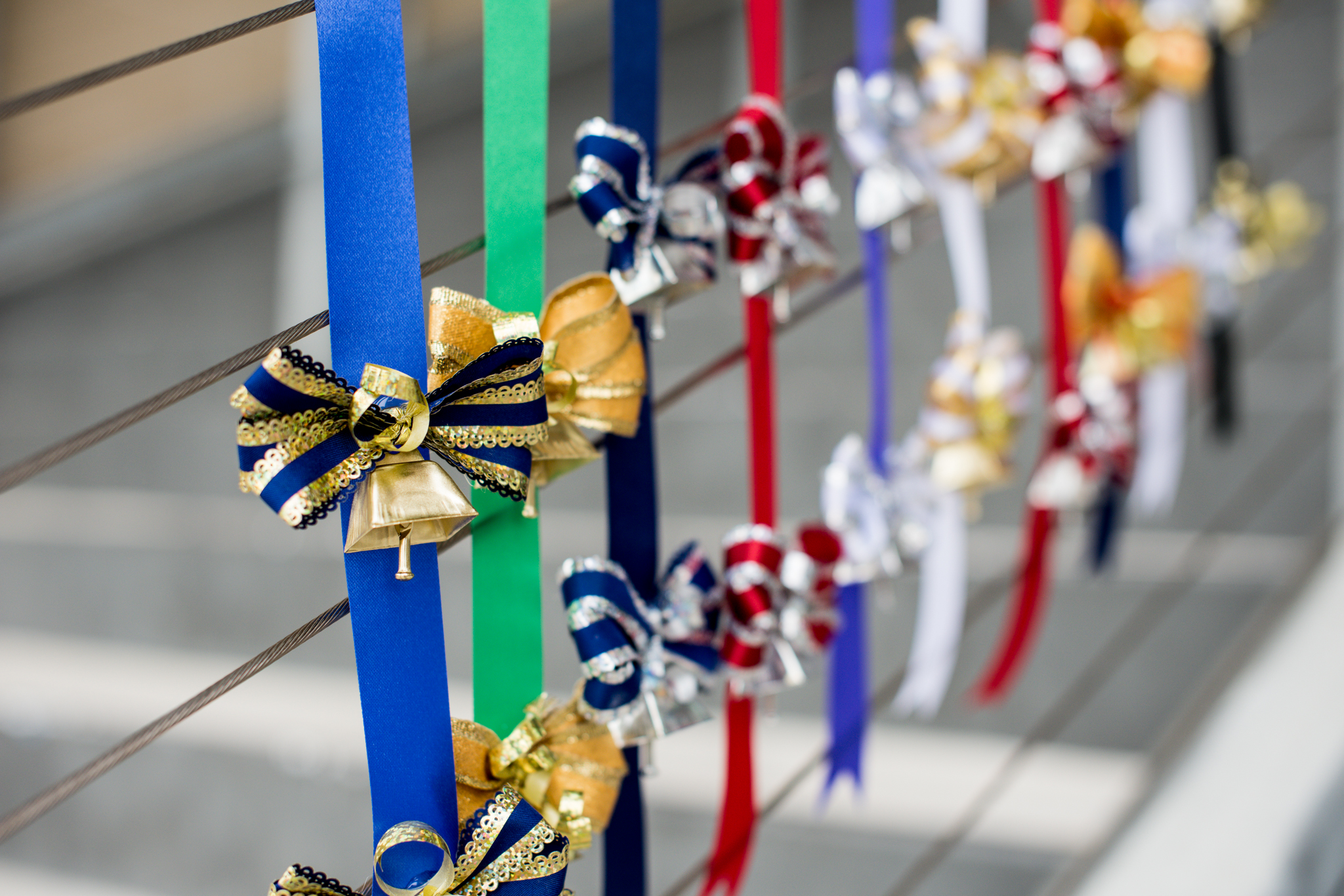 A ribbon with two bows and two cowbells in variations of school colors.
